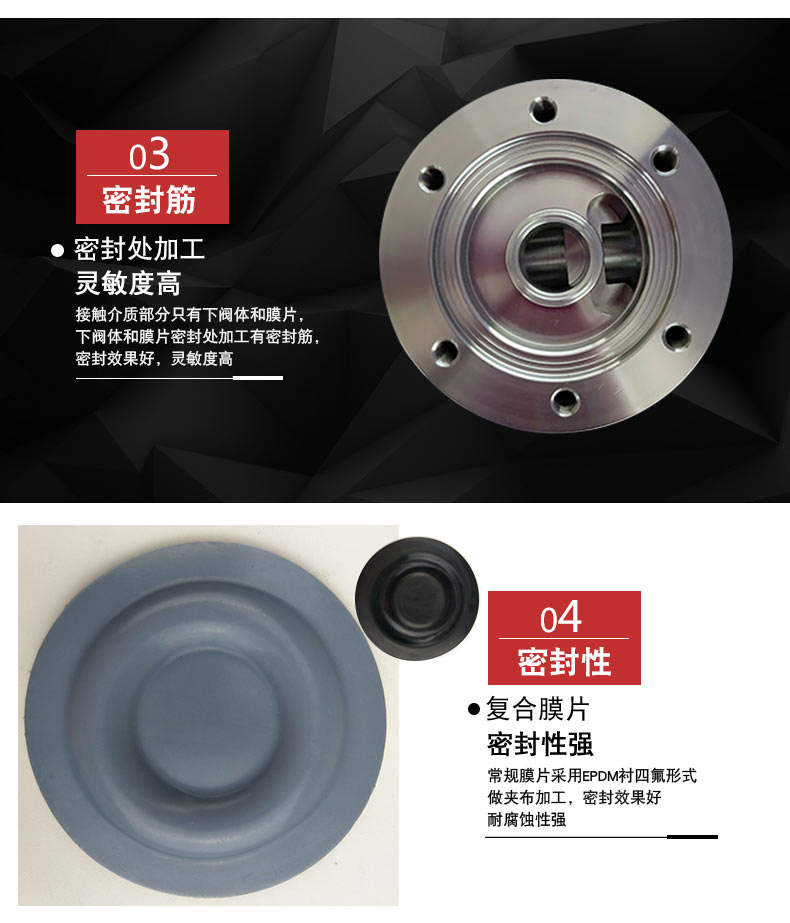 •接觸介質部分只有下閥體和膜片,下閥體和膜片密封處加工有密封筋,密封效果好,靈敏度高